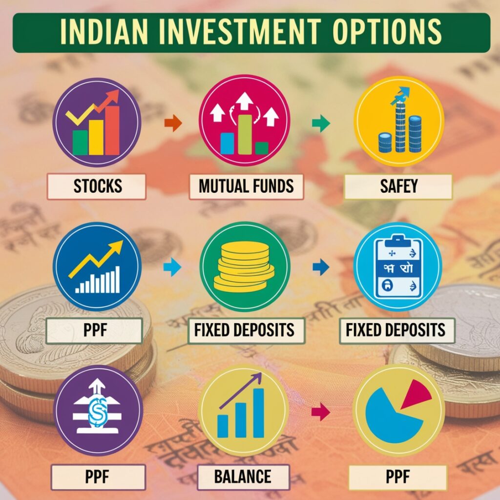 In India, there are many options to make your money work for you. Each one offers different levels of risk and return, so it’s important to choose based on what feels right for you: